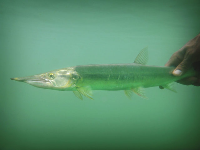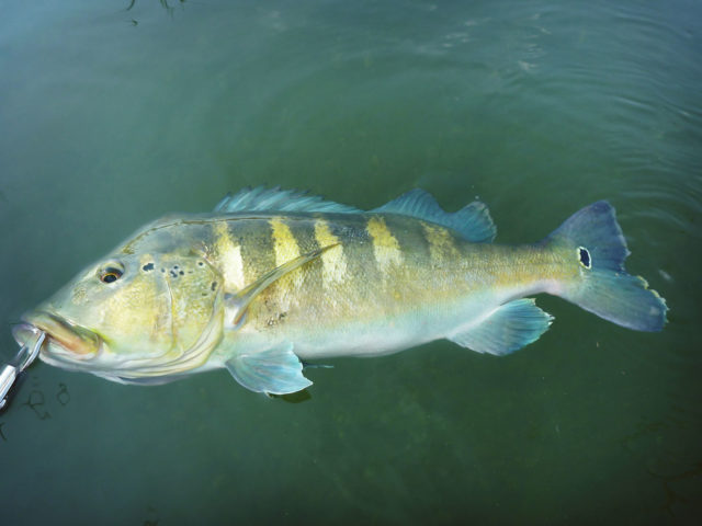 A pescaria pode ser realizada tanto com iscas vivas, como com artificiais, equipamento recomendado:
